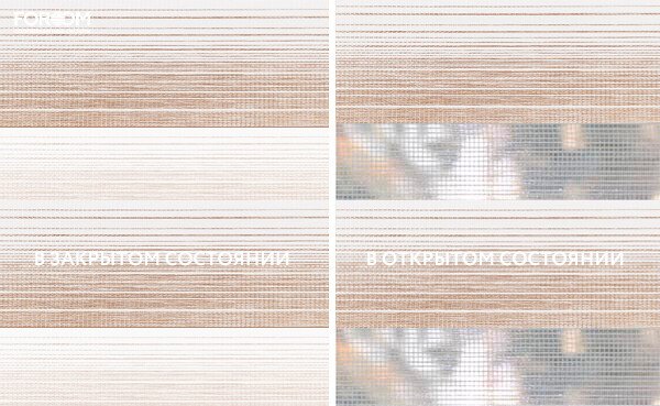 Полотно ткани, состоит из чередующихся горизонтальных полос – прозрачных и непрозрачных. Изменяя положение этих полос относительно друг другу, можно создать целых 3 режима регулировки светом. Например, чтобы в помещении стало светлее, нужно расположить прозрачные полосы друг напротив друга. Если разместить прозрачную и непрозрачную полосу параллельно друг другу, то можно добиться практически полного затемнения.
